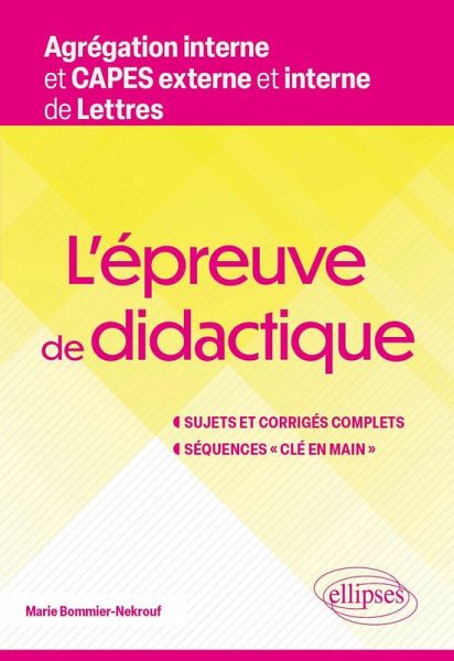 Cet ouvrage s'adresse prioritairement aux candidats aux agrégations de Lettres, pour la préparation de l'une des épreuves écrites, mais aussi aux candidats au CAPES de Lettres modernes, pour la préparation de l'épreuve orale de didactique. Les professeurs pourront aussi y trouver des éléments pour enrichir la préparation de leurs cours. Il propose : -une partie méthodologique, -des sujets et des corrigés complets, entièrement rédigés, -un lexique de termes techniques. Marie BOMMIER-NEKROUF est agrégée de Lettres. Professeure de Chaire Supérieure, elle enseigne en Hypokhâgne et en Khâgne. Membre des jurys de CAPES et d'agrégation de Lettres, elle a aussi été chargée de mission d'inspection, et formatrice en didactique.