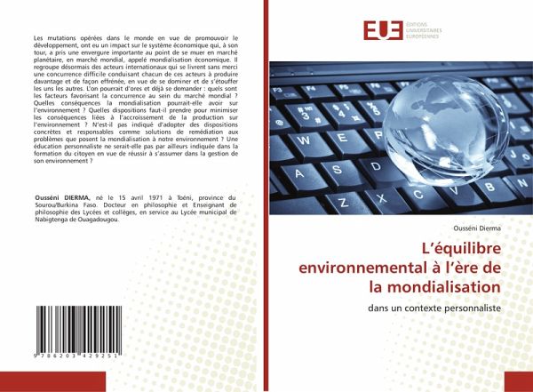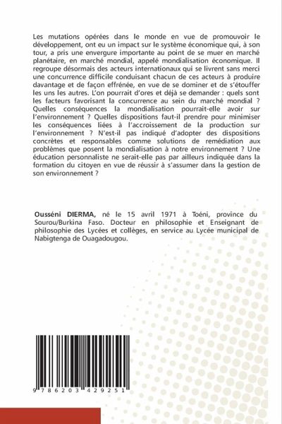 Les mutations opérées dans le monde en vue de promouvoir le développement, ont eu un impact sur le système économique qui, à son tour, a pris une envergure importante au point de se muer en marché planétaire, en marché mondial, appelé mondialisation économique. Il regroupe désormais des acteurs internationaux qui se livrent sans merci une concurrence difficile conduisant chacun de ces acteurs à produire davantage et de façon effrénée, en vue de se dominer et de s'étouffer les uns les autres. L'on pourrait d'ores et déjà se demander : quels sont les facteurs favorisant la concurrence au sein du marché mondial ? Quelles conséquences la mondialisation pourrait-elle avoir sur l'environnement ? Quelles dispositions faut-il prendre pour minimiser les conséquences liées à l'accroissement de la production sur l'environnement ? N'est-il pas indiqué d'adopter des dispositions concrètes et responsables comme solutions de remédiation aux problèmes que posent la mondialisation à notre environnement ? Une éducation personnaliste ne serait-elle pas par ailleurs indiquée dans la formation du citoyen en vue de réussir à s'assumer dans la gestion de son environnement ?