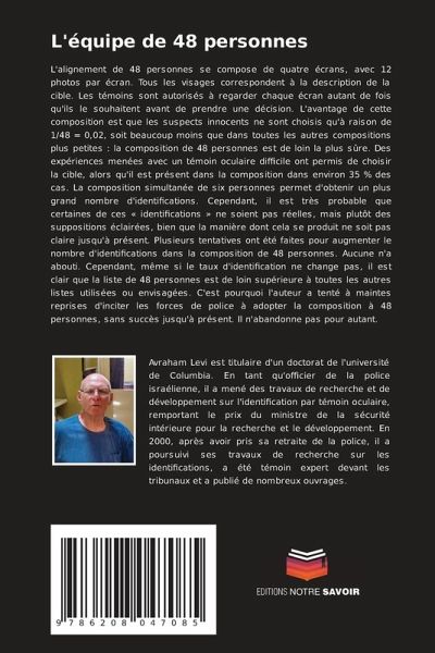 L'alignement de 48 personnes se compose de quatre écrans, avec 12 photos par écran. Tous les visages correspondent à la description de la cible. Les témoins sont autorisés à regarder chaque écran autant de fois qu'ils le souhaitent avant de prendre une décision. L'avantage de cette composition est que les suspects innocents ne sont choisis qu'à raison de 1/48 = 0,02, soit beaucoup moins que dans toutes les autres compositions plus petites : la composition de 48 personnes est de loin la plus sûre. Des expériences menées avec un témoin oculaire difficile ont permis de choisir la cible, alors qu'il est présent dans la composition dans environ 35 % des cas. La composition simultanée de six personnes permet d'obtenir un plus grand nombre d'identifications. Cependant, il est très probable que certaines de ces « identifications » ne soient pas réelles, mais plutôt des suppositions éclairées, bien que la manière dont cela se produit ne soit pas claire jusqu'à présent. Plusieurs tentatives ont été faites pour augmenter le nombre d'identifications dans la composition de 48 personnes. Aucune n'a abouti. Cependant, même si le taux d'identification ne change pas, il est clair que la liste de 48 personnes est de loin supérieure à toutes les autres listes utilisées ou envisagées. C'est pourquoi l'auteur a tenté à maintes reprises d'inciter les forces de police à adopter la composition à 48 personnes, sans succès jusqu'à présent. Il n'abandonne pas pour autant.