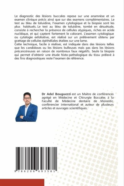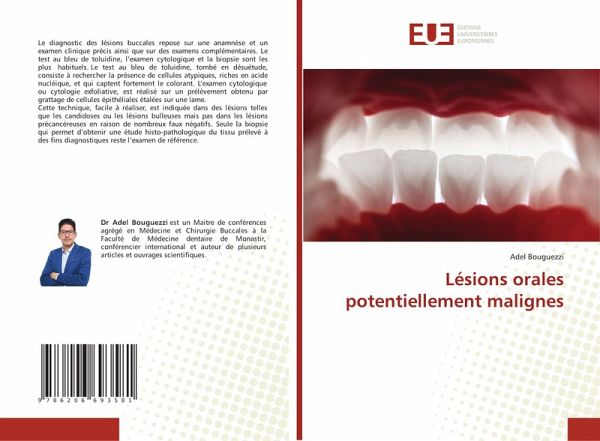 Le diagnostic des lésions buccales repose sur une anamnèse et un examen clinique précis ainsi que sur des examens complémentaires. Le test au bleu de toluidine, l'examen cytologique et la biopsie sont les plus habituels. Le test au bleu de toluidine, tombé en désuétude, consiste à rechercher la présence de cellules atypiques, riches en acide nucléique, et qui captent fortement le colorant. L'examen cytologique ou cytologie exfoliative, est réalisé sur un prélèvement obtenu par grattage de cellules épithéliales étalées sur une lame. Cette technique, facile à réaliser, est indiquée dans des lésions telles que les candidoses ou les lésions bulleuses mais pas dans les lésions précancéreuses en raison de nombreux faux négatifs. Seule la biopsie qui permet d'obtenir une étude histo-pathologique du tissu prélevé à des fins diagnostiques reste l'examen de référence.