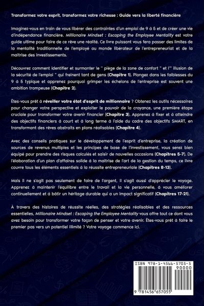 Transformez votre esprit, transformez votre richesse : Guide vers la liberté financière Imaginez-vous en train de vous libérer des contraintes d'un emploi de 9 à 5 et de créer une vie d'indépendance financière. Millionaire Mindset : Escaping the Employee Mentality est votre guide ultime pour faire de ce rêve une réalité. Ce livre puissant vous fera passer des limites de la mentalité traditionnelle de l'employé au monde libérateur de l'entrepreneuriat et de la maîtrise des investissements. Découvrez comment identifier et surmonter le " piège de la zone de confort " et l'" illusion de la sécurité de l'emploi " qui freinent tant de gens (Chapitre 1). Plongez dans les faiblesses du 9 à 5 typique et apprenez pourquoi grimper les échelons de l'entreprise est souvent une ambition trompeuse (Chapitre 2). Êtes-vous prêt à réveiller votre état d'esprit de millionnaire ? Obtenez les outils nécessaires pour changer votre perspective et exploiter le pouvoir de la croyance, une première étape cruciale pour transformer votre avenir financier (Chapitre 3). Apprenez à fixer et à atteindre des objectifs financiers à court et à long terme à l'aide du cadre des objectifs SMART, en transformant des rêves abstraits en plans réalisables (Chapitre 4). Avec des conseils pratiques sur le développement de l'esprit d'entreprise, la création de sources de revenus multiples et les principes de base de l'investissement, vous serez bien équipé pour prendre des risques calculés et saisir de nouvelles occasions (Chapitres 5-7). De l'élaboration d'un plan d'affaires solide à la maîtrise de l'art de la gestion du temps, ce livre couvre tous les éléments essentiels à la réussite entrepreneuriale (Chapitres 8-13). Mais il ne s'agit pas seulement de faire de l'argent, il s'agit aussi d'apprécier le voyage. Apprenez à maintenir l'équilibre entre le travail et la vie personnelle, à vous améliorer continuellement et à bâtir un héritage durable qui a un impact significatif (Chapitres 17-21). À travers des histoires de réussite réelles, des stratégies réalisables et des ressources essentielles, Millionaire Mindset : Escaping the Employee Mentality vous offre tout ce dont vous avez besoin pour transformer votre façon de penser et votre avenir. Êtes-vous prêt à faire le premier pas vers un potentiel illimité ? Votre voyage commence ici.