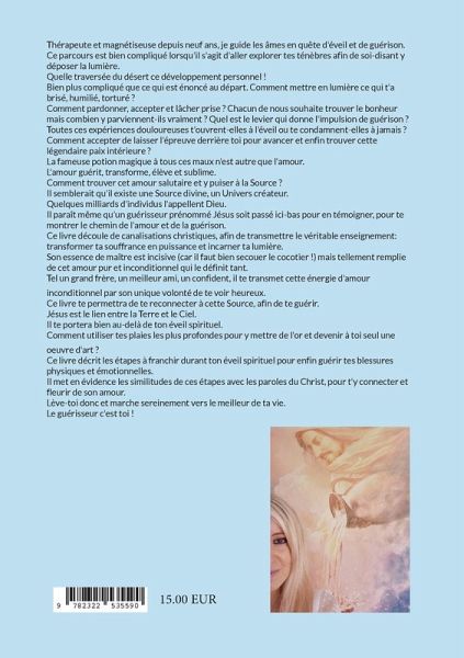Thérapeute et magnétiseuse depuis neuf ans, je guide les âmes en quête d'éveil et de guérison. Ce parcours est bien compliqué lorsqu'il s'agit d'aller explorer tes ténèbres afin de soi-disant y déposer la lumière. Quelle traversée du désert ce développement personnel ! Bien plus compliqué que ce qui est énoncé au départ. Comment mettre en lumière ce qui t'a brisé, humilié, torturé ? Comment pardonner, accepter et lâcher prise ? Chacun de nous souhaite trouver le bonheur mais combien y parviennent-ils vraiment ? Quel est le levier qui donne l'impulsion de guérison ? Toutes ces expériences douloureuses t'ouvrent-elles à l'éveil ou te condamnent-elles à jamais ? Comment accepter de laisser l'épreuve derrière toi pour avancer et enfin trouver cette légendaire paix intérieure ? La fameuse potion magique à tous ces maux n'est autre que l'amour. L'amour guérit, transforme, élève et sublime. Comment trouver cet amour salutaire et y puiser à la Source ? Il semblerait qu'il existe une Source divine, un Univers créateur. Quelques milliards d'individus l'appellent Dieu. Il paraît même qu'un guérisseur prénommé Jésus soit passé ici-bas pour en témoigner, pour te montrer le chemin de l'amour et de la guérison. Ce livre découle de canalisations christiques, afin de transmettre le véritable enseignement: transformer ta souffrance en puissance et incarner ta lumière. Son essence de maître est incisive (car il faut bien secouer le cocotier !) mais tellement remplie de cet amour pur et inconditionnel qui le définit tant. Tel un grand frère, un meilleur ami, un confident, il te transmet cette énergie d'amour inconditionnel par son unique volonté de te voir heureux. Ce livre te permettra de te reconnecter à cette Source, afin de te guérir. Jésus est le lien entre la Terre et le Ciel. Il te portera bien au-delà de ton éveil spirituel. Comment utiliser tes plaies les plus profondes pour y mettre de l'or et devenir à toi seul une oeuvre d'art ? Ce livre décrit les étapes à franchir durant ton éveil spirituel pour enfin guérir tes blessures physiques et émotionnelles. Il met en évidence les similitudes de ces étapes avec les paroles du Christ, pour t'y connecter et fleurir de son amour. Lève-toi donc et marche sereinement vers le meilleur de ta vie. Le guérisseur c'est toi !