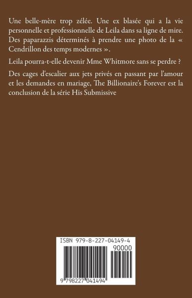 Une belle-mère trop zélée. Une ex blasée qui a la vie personnelle et professionnelle de Leila dans sa ligne de mire. Des paparazzis déterminés à prendre une photo de la Cendrillon des temps modernes . Leila pourra-t-elle devenir Mme Whitmore sans se perdre ? Des cages d'escalier aux jets privés en passant par l'amour et les demandes en mariage, The Billionaire's Forever est la conclusion de la série His Submissive