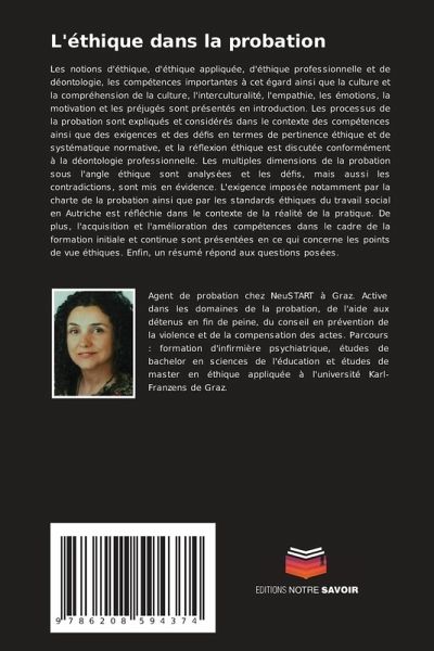 Les notions d'éthique, d'éthique appliquée, d'éthique professionnelle et de déontologie, les compétences importantes à cet égard ainsi que la culture et la compréhension de la culture, l'interculturalité, l'empathie, les émotions, la motivation et les préjugés sont présentés en introduction. Les processus de la probation sont expliqués et considérés dans le contexte des compétences ainsi que des exigences et des défis en termes de pertinence éthique et de systématique normative, et la réflexion éthique est discutée conformément à la déontologie professionnelle. Les multiples dimensions de la probation sous l'angle éthique sont analysées et les défis, mais aussi les contradictions, sont mis en évidence. L'exigence imposée notamment par la charte de la probation ainsi que par les standards éthiques du travail social en Autriche est réfléchie dans le contexte de la réalité de la pratique. De plus, l'acquisition et l'amélioration des compétences dans le cadre de la formation initiale et continue sont présentées en ce qui concerne les points de vue éthiques. Enfin, un résumé répond aux questions posées.