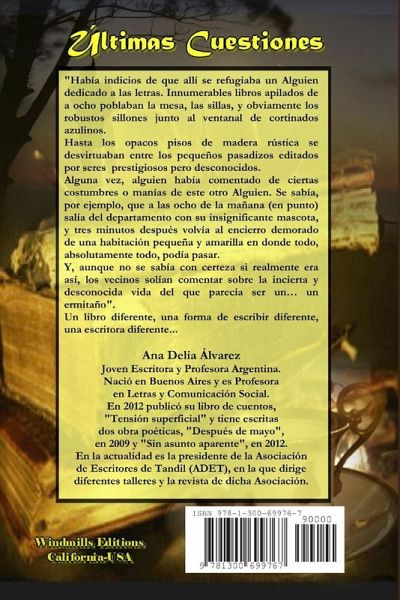 Había indicios de que allí se refugiaba un Alguien dedicado a las letras. Innumerables libros apilados de a ocho poblaban la mesa, las sillas, y obviamente los robustos sillones junto al ventanal de cortinados azulinos. Y, aunque no se sabía con certeza si realmente era así, los vecinos solían comentar sobre la incierta y desconocida vida del que parecía ser un... un ermitaño. Un libro diferente, una forma de escribir diferente, una escritora diferente... Ana Delia Álvarez Joven Escritora y Profesora Argentina. Nació en Buenos Aires y es Profesora en Letras y Comunicación Social . En 2012 publico su libro de cuentos, "Tensión superficial" y tiene escritos dos obra poeticas, "Después de mayo", en 2009 y "Sin asunto aparente", en 2012. En la actualidad es presidente de la Asociación de Escritores de Tandil (ADET), en el que dirige diferentes talleres y la revista de dicha Asociación.
