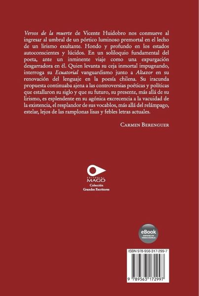 "Versos de la muerte de Vicente Huidobro nos conmueve al ingresar al umbral de un pórtico luminoso premortal en el lecho de un lirismo exultante. Hondo y profundo en los estados autoconscientes y lúcidos. En un soliloquio fundamental del poeta, ante un inminente viaje como una expurgación desgarradora en él. Quien levanta su ceja inmortal impugnando, interroga su Ecuatorial vanguardismo junto a Altazor en su renovación del lenguaje en la poesía chilena. Su iracunda propuesta continuaba ajena a las controversias poéticas y políticas que estallaron su siglo y que su futuro, su presente, más allá de su lirismo, es esplendente en su agónica excrecencia a la vacuidad de la existencia, el resplandor de sus vocablos, más allá del relámpago, estelar, lejos de las ramplonas lisas y febles letras actuales". Carmen Berenguer