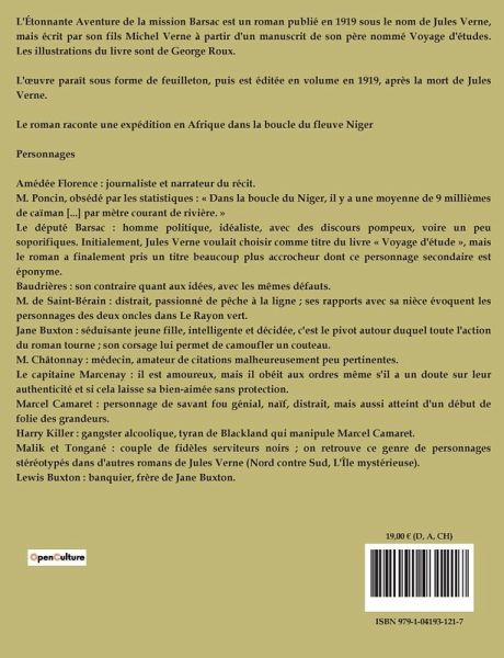 L'Étonnante Aventure de la mission Barsac est un roman publié en 1919 sous le nom de Jules Verne, mais écrit par son fils Michel Verne à partir d'un manuscrit de son père nommé Voyage d'études. Les illustrations du livre sont de George Roux. L'¿uvre paraît sous forme de feuilleton, puis est éditée en volume en 1919, après la mort de Jules Verne. Le roman raconte une expédition en Afrique dans la boucle du fleuve Niger Personnages Amédée Florence : journaliste et narrateur du récit. M. Poncin, obsédé par les statistiques : « Dans la boucle du Niger, il y a une moyenne de 9 millièmes de caïman [...] par mètre courant de rivière. » Le député Barsac : homme politique, idéaliste, avec des discours pompeux, voire un peu soporifiques. Initialement, Jules Verne voulait choisir comme titre du livre « Voyage d'étude », mais le roman a finalement pris un titre beaucoup plus accrocheur dont ce personnage secondaire est éponyme. Baudrières : son contraire quant aux idées, avec les mêmes défauts. M. de Saint-Bérain : distrait, passionné de pêche à la ligne ; ses rapports avec sa nièce évoquent les personnages des deux oncles dans Le Rayon vert. Jane Buxton : séduisante jeune fille, intelligente et décidée, c'est le pivot autour duquel toute l'action du roman tourne ; son corsage lui permet de camoufler un couteau. M. Châtonnay : médecin, amateur de citations malheureusement peu pertinentes. Le capitaine Marcenay : il est amoureux, mais il obéit aux ordres même s'il a un doute sur leur authenticité et si cela laisse sa bien-aimée sans protection. Marcel Camaret : personnage de savant fou génial, naïf, distrait, mais aussi atteint d'un début de folie des grandeurs. Harry Killer : gangster alcoolique, tyran de Blackland qui manipule Marcel Camaret. Malik et Tongané : couple de fidèles serviteurs noirs ; on retrouve ce genre de personnages stéréotypés dans d'autres romans de Jules Verne (Nord contre Sud, L'Île mystérieuse). Lewis Buxton : banquier, frère de Jane Buxton.