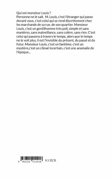 Qui est monsieur Louis ?Personne ne le sait. M. Louis, c'est l'étranger qui passe devant vous, c'est celui qui se rend discrètement chez les marchands de sa rue, de son quartier. Monsieur Louis, c'est un gentilhomme très poli, simple et sans manières, sans malveillance, sans colère, sans rien. C'est celui qui passera à travers le temps, alors que le temps ne le voit plus, il est l'invisible du présent, du passé et du futur. Monsieur Louis, c'est un fantôme, c'est un mystère,c'est un climat incertain, c'est une anomalie de l'époque...