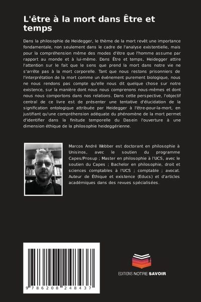 Dans la philosophie de Heidegger, le thème de la mort revêt une importance fondamentale, non seulement dans le cadre de l'analyse existentielle, mais pour la compréhension même des modes d'être que l'homme assume par rapport au monde et à lui-même. Dans Être et temps, Heidegger attire l'attention sur le fait que le sens que prend la mort dans notre vie ne s'arrête pas à la mort corporelle. Tant que nous restons prisonniers de l'interprétation de la mort comme un événement purement biologique, nous ne nous rendons pas compte qu'elle nous dit quelque chose sur notre existence, sur la manière dont nous nous comprenons nous-mêmes et dont nous nous comportons dans nos relations. Dans cette perspective, l'objectif central de ce livre est de présenter une tentative d'élucidation de la signification ontologique attribuée par Heidegger à l'être-pour-la-mort, en justifiant qu'une compréhension adéquate du phénomène de la mort permet d'identifier dans la finitude temporelle du Dasein l'ouverture à une dimension éthique de la philosophie heideggérienne.