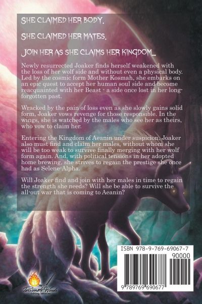 She claimed her body. She claimed her mates. Join her as she claims her kingdom... Newly resurrected Joaker finds herself weakened with the loss of her wolf side and without even a physical body. Led by the cosmic form Mother Kosmah, she embarks on an epic quest to accept her human soul side and become reacquainted with her Beast - a side once lost in her long-forgotten past. Wracked by the pain of loss even as she slowly gains solid form, Joaker vows revenge for those responsible. In the wings, she is watched by the males who see her as theirs, who vow to claim her. Entering the Kingdom of Aeanin under suspicion, Joaker also must find and claim her males, without whom she will be too weak to survive finally merging with her wolf form again. And, with political tensions in her adopted home brewing, she strives to regain the prestige she once had as Selene-Alpha. Will Joaker find and join with her males in time to regain the strength she needs? Will she be able to survive the all-out war that is coming to Aeanin?