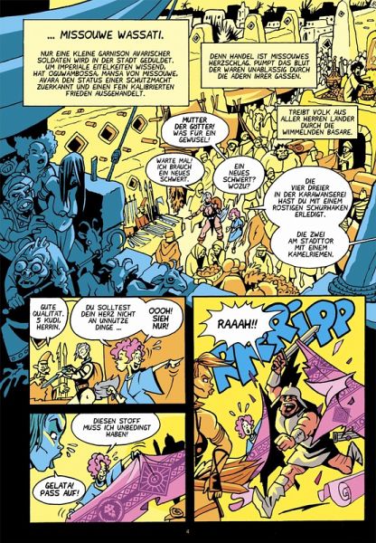 Die Wolfschwänzin macht auf ihrer Reise durch die hitzeflimmernden Weiten Halt in der Oasenstadt Missouwe Wassati, der von reichen Karawanen fett gemästeten Perle der Wüste. Hier herrscht der mächtige Mansa, aber auch Avara hat seine Soldaten in einer kleinen Garnision postiert ...