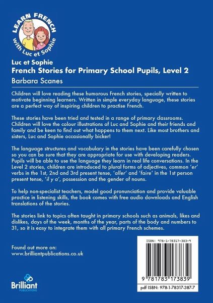 Children will love reading these humorous French stories, specially written to motivate beginning learners. Written in simple everyday language, these stories are a perfect way of inspiring children to practise French. These stories have been tried and tested in a range of primary classrooms. Children will love the colour illustrations of Luc and Sophie and their friends and family and be keen to find out what happens to them next. Like most brothers and sisters, Luc and Sophie occasionally bicker! The language structures and vocabulary in the stories have been carefully chosen so you can be sure that they are appropriate for use with developing readers. Pupils will be able to use the language they learn in real life conversations. In the Level 2 stories, children are introduced to plural forms of adjectives, common 'er' verbs in the 1st, 2nd and 3rd present tense, 'aller' and 'faire' in the 1st person present tense, 'il y a', possession and the gender of nouns. To help non-specialist teachers, model good pronunciation and provide valuable practice in listening skills, the book comes with free audio downloads and English translations of the stories. The stories link to topics often taught in primary schools such as animals, likes and dislikes, days of the week, months of the year, parts of the body and numbers to 31, so it is easy to integrate them with all primary French schemes.