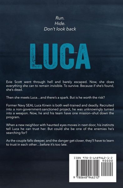 Run. Hide. Don't look back. Evie Scott went through hell and barely escaped. Now, she does everything she can to remain invisible. To survive. Because if she's found, she's dead. Then she meets Luca...and there's a spark. But is he worth the risk? Former Navy SEAL Luca Kirwin is both well-trained and deadly. Recruited into a non-government-sanctioned project, he was unknowingly turned into a weapon. Now, he and his team have one mission-shut down the program. When a new neighbor with haunted eyes moves in next door, his instincts tell Luca he can trust her. But could she be one of the enemies he's searching for? As the couple falls deeper, and the danger get closer, they'll have to learn to trust in each other...before it's too late.