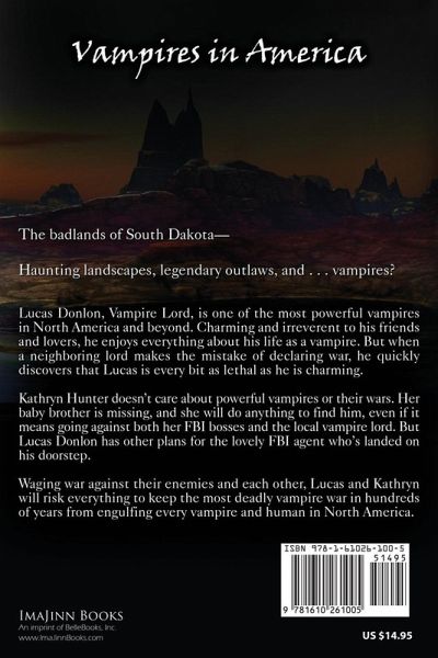 The badlands of South Dakota . . . haunting landscapes, legendary outlaws, and . . . vampires? Lucas Donlon, Vampire Lord, is one of the most powerful vampires in North America and beyond. Charming and irreverent to his friends and lovers, he enjoys everything about his life as a vampire. But when a neighboring lord makes the mistake of declaring war, he quickly discovers that Lucas is every bit as lethal as he is charming. Kathryn Hunter doesn’t care about powerful vampires or their wars. Her baby brother is missing, and she will do anything to find him, even if it means going against both her FBI bosses and the local vampire lord. But Lucas Donlon has other plans for the lovely FBI agent who’s landed on his doorstep. Waging war against their enemies and each other, Lucas and Kathryn will risk everything to keep the most deadly vampire war in hundreds of years from engulfing every vampire and human in North America.
