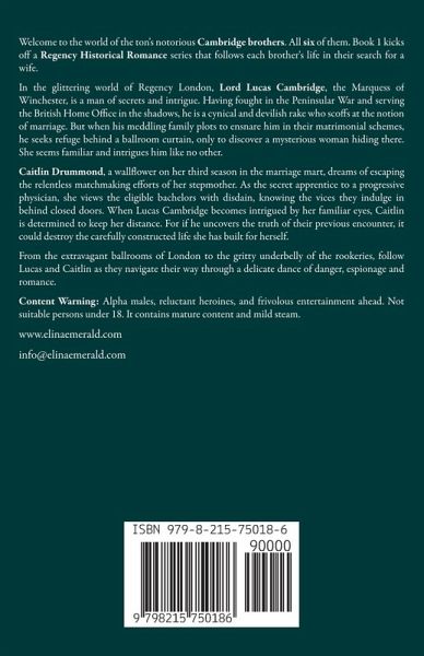 Welcome to the world of the ton's notorious Cambridge brothers. All six of them. Book 1 kicks off a regency historical romance series that follows each brother's life in their search for a wife. In the glittering world of Regency London, Lord Lucas Cambridge, the Marquess of Winchester, is a man of secrets and intrigue. Having fought in the Peninsular War and serving the British Home Office in the shadows, he is a cynical and devilish rake who scoffs at the notion of marriage. But when his meddling family plots to ensnare him in their matrimonial schemes, he seeks refuge behind a ballroom curtain, only to discover a mysterious woman hiding there. She seems familiar and intrigues him like no other. Caitlin Drummond, a wallflower on her third season in the marriage mart, dreams of escaping the relentless matchmaking efforts of her stepmother. As the secret apprentice to a progressive physician, she views the eligible bachelors with disdain, knowing the vices they indulge in behind closed doors. When Lucas Cambridge becomes intrigued by her familiar eyes, Caitlin is determined to keep her distance. For if he uncovers the truth of their previous encounter, it could destroy the carefully constructed life she has built for herself. From the extravagant ballrooms of London to the gritty underbelly of the rookeries, follow Lucas and Caitlin as they navigate their way through a delicate dance of danger, espionage and romance. Content Warning: Alpha males, reluctant heroines, and frivolous entertainment ahead. Not suitable persons under 18. It contains mature content and mild steam.