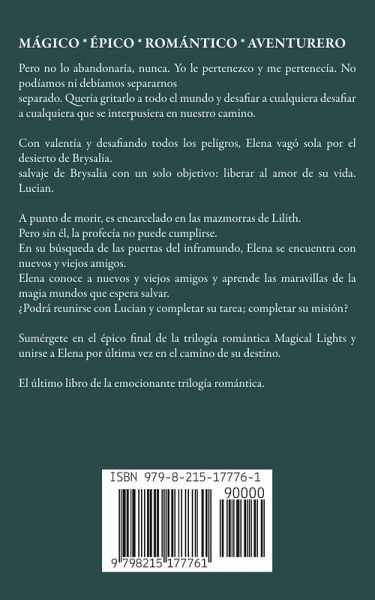 MÁGICO * ÉPICO * ROMÁNTICO * AVENTURERO Pero no lo abandonaría, nunca. Yo le pertenezco y me pertenecía. No podíamos ni debíamos separarnos separado. Quería gritarlo a todo el mundo y desafiar a cualquiera desafiar a cualquiera que se interpusiera en nuestro camino. Con valentía y desafiando todos los peligros, Elena vagó sola por el desierto de Brysalia. salvaje de Brysalia con un solo objetivo: liberar al amor de su vida. Lucian. A punto de morir, es encarcelado en las mazmorras de Lilith. Pero sin él, la profecía no puede cumplirse. En su búsqueda de las puertas del inframundo, Elena se encuentra con nuevos y viejos amigos. Elena conoce a nuevos y viejos amigos y aprende las maravillas de la magia mundos que espera salvar. ¿Podrá reunirse con Lucian y completar su tarea; completar su misión? Sumérgete en el épico final de la trilogía romántica Magical Lights y unirse a Elena por última vez en el camino de su destino. El último libro de la emocionante trilogía romántica.