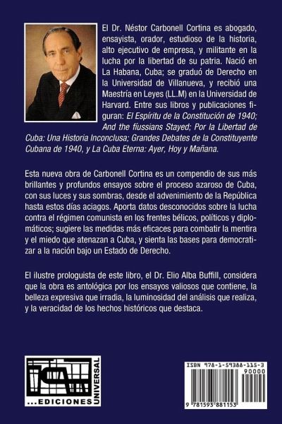 El Dr.Néstor Carbonell Cortina es abogado, ensayista, orador, estudioso de la historia, alto ejecutivo de empresa y militante en la lucha por la libertad de su patria. Nació en La Habana, Cuba; se graduó de Derecho en la Universidad de Villanueva y recibió una Maestría en Leyes (LL.M) en Harvard University. Entre sus libros y publicaciones figuran: El Espíritu de la Constitución Cubana de 1940; And the Russians Stayed; Por la libertad de Cuba, una historia inconclusa; Grandes debates de la Constituyente Cubana de 1940 y La Cuba Eterna, Ayer Hoy y Mañana. Este libro, LUCES Y SOMBRAS DE CUBA es un compendio de los más brillantes e importantes ensayos sobre el proceso azaroso de Cuba, con sus luces y sus sombras, desde el advenimiento de la República hasta estos días aciagos. Aporta datos desconocidos sobre la lucha contra el régimen comunista en los frentes bélicos, políticos y diplomáticos, siendo testigo en muchos de ellos. Sugiere las medidas más eficaces para combatir la mentira y el miedo que atenazan a Cuba, y sienta las bases para democratizar a la nación en un Estado de Derecho. El ilustre prologuista de este libro, el Dr. Elio Alba Buffil, considera que la obra es antológica por los ensayos valiosos que contiene, la belleza expresiva, la luminosidad del análisis que realiza y la veracidad de los hechos que destaca. Un libro que muestra los errores y aciertos en la historia de Cuba y los caminos para lograr una nación feliz, libre, justa, solidaria, con todos y para el bien de todos. Dr. Néstor Carbonell Cortina is a lawyer, essayist, orator, history scholar, senior business executive and militant in the struggle for the freedom of his homeland. He was born in Havana, Cuba; He received a law degree from Villanueva University and a Master of Laws (LL.M) from Harvard University. His books and publications include: El Espíritu de la Constitución Cubana de 1940; And the Russians Stayed; Por la libertad de Cuba, una historia inconclusa; Grandes debates de la Constituyente Cubana de 1940 y La Cuba Eterna, Ayer Hoy y Mañana. This book is a compendium of the most brilliant and important essays on the eventful process of Cuba, with its lights and shadows, from the advent of the Republic to these fateful days. He provides unknown data on the struggle against the communist regime on the war, political and diplomatic fronts, being a witness in many of them. It suggests the most effective measures to combat the lies and fear that grip Cuba, and lays the groundwork to democratize the nation under the rule of law. The illustrious prologue writer of this book, Dr. Elio Alba Buffil, considers the work to be anthological because of the valuable essays it contains, the expressive beauty, the luminosity of the analysis it carries out and the veracity of the facts it highlights. A book that shows the mistakes and successes in the history of Cuba and the ways to achieve a happy, free, just, supportive nation, with everyone and for the good of all.