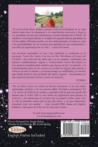 From the Foreword by Jane Goodall PhD, DBE United Nations Messenger of Peace: "This book tells the fascinating story of a passionate, talented and, above all, warm-hearted woman, determined to stay true to her vision, to live out her dream, and to learn all she can from the world around her. It will inspire and encourage you to follow your dreams, to live life to the full, take all it has to offer and - most importantly - to give back in full measure". English poems included. Lucia De Garcia AWA (Award Winning Author) National Tour 2014-2015 and other presentations. Book presentations and signing at the following events for the next three months: CABE Convention (California Association of Bilingual Education) April 2 and 3rd, 2014 - Anaheim, California with over 4,000 people. The Los Angeles Times Festival of Books April 12th and 13th at University of Southern California, USC in Los Angeles. More than 150,000 people in attendance. www.Latimes.com/festivalofbooks Latino Family Festival of Books May 3rd at the California State University San Bernardino in San Bernardino, California Seminario Motivacion y Negocios Sunday June 22 - 10-2 pm Salon Fiesta Mexicana, Los Angeles American Library Association Annual Convention, June 27-30th in Las Vegas, Nevada Centro Gaucho Martin Fierro Sunday, July 6 from 5-8:30 pm in Newport Beach, California LULAC (League of United Latin-American Citizens) National Convention, July 10-12 in New York with over 4,000 leaders. NCLR (National Council of La Raza) Annual Convention, July 19-21 in Los Angeles with over 25,000 in attendance. Laguna Woods Writters Club presents The Literary Works of Lucia De Garcia, October 7, 2014, an Orange County community with over 18,000 residents. Los Angeles Latino Book & Family Festival of Books, November 1st. East Los Angeles College (ELAC)Performing Fine Arts Complex. XXXIV World Congress of Poets/World Academy of Arts and Culture/UNESCO, November 10-14, 2014, Lima and Trujillo, Peru. California Association for Bilingual Education CABE's 2015 Conference, March 4-7, 2015 in San Diego. The conference have around 4,000 educators at it and is the largest conference in the USA for Latino educators REFORMA, the National Association of Latino librarians Conference, April 1-4, 2015 in San Diego with the participation of 700 librarians from around the USA and Mexico. Other events will be announced soon! Please come and visit! Orange County, California 92612 U.S.A. Telephone Cell: (714) 904-5507 E-mail: luciadegarcia2012@gmail.com Webpages: www.luciadegarcia.com FACEBOOK: Lucia De Garcia Vice President sipeaiberoamericana.com Ambassadress for Peace, Le Cercle Universel de la Paix, Switzerland and France 2011 Please Visit: www.lifebyme.com/lucia-de-garcia-transform/ The book "Building Bridges of Understanding - My Personal Quest for Unity and Peace" was chosen as "The Most Inspirational Non-Fiction Book" by Latino Literacy Now's International Latino Book Awards. This book, and the book of Poems, "Lucia De Garcia, A Peaceful Light - My Odyssey to the Center of the Heart", are available worldwide in hardcover, softcover and eBook. To order the books from your local bookstore, call 888-795-4274 ext. 7879, or order on line at www.Xlibris.com, www.Amazon.com, www.barnesandnoble.com or to luciadegarcia2012@gmail.com
