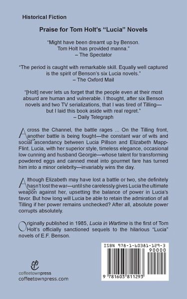 Across the Channel, the battle rages ... On the Tilling front, another battle is being fought-the constant war of wits and social ascendancy between Lucia Pillson and Elizabeth Mapp-Flint. Lucia, with her superior style, timeless elegance, occasional low cunning and husband Georgie-whose talent for transforming powdered eggs and canned meat into gourmet fare has turned him into a minor celebrity-invariably wins the day. Although Elizabeth may have lost a battle or two, she definitely hasn't lost the war-until she carelessly gives Lucia the ultimate weapon against her, upsetting the balance of power in Lucia's favor. But how long will Lucia be able to retain the admiration of all Tilling if her power remains unchecked? After all, absolute power corrupts absolutely. Originally published in 1985, Lucia in Wartime is the first of Tom Holt's officially sanctioned sequels to the hilarious "Lucia" novels of E.F. Benson.
