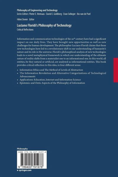 Information and communication technologies of the 20th century have had a significant impact on our daily lives. They have brought new opportunities as well as new challenges for human development. The Philosopher: Luciano Floridi claims that these new technologies have led to a revolutionary shift in our understanding of humanity's nature and its role in the universe. Florodi's philosophical analysis of new technologies leads to a novel metaphysical framework in which our understanding of the ultimate nature of reality shifts from a materialist one to an informational one. In this world, all entities, be they natural or artificial, are analyzed as informational entities. This book provides critical reflection to this idea, in four different areas: Information Ethics and The Method of Levels of Abstraction The Information Revolution and Alternative Categorizations of Technological Advancements Applications: Education, Internet and Information Science Epistemic and Ontic Aspects of the Philosophy of Information