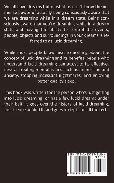 We all have dreams but most of us don't know the immense power of actually being consciously aware that we are dreaming while in a dream state. Being consciously aware that you're dreaming while in a dream state and having the ability to control the events, people, objects and surroundings in your dreams is referred to as lucid dreaming. While most people know next to nothing about the concept of lucid dreaming and its benefits, people who understand lucid dreaming can attest to its effectiveness at treating mental issues such as depression and anxiety, stopping incessant nightmares, and enjoying better quality sleep. This book was written for the person who's just getting into lucid dreaming, or has a few lucid dreams under their belt. It goes over the history of lucid dreaming, the science behind it, and goes in depth on all the techniques used to master the art of lucid dreaming. Different perspectives are laid out in describing how you can benefit from lucid dreaming in your everyday life as well. When you're ready to literally live your dreams, this book will be waiting for you!