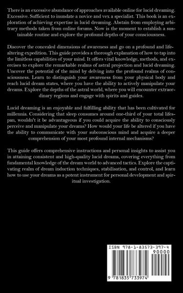 There is an excessive abundance of approaches available online for lucid dreaming. Excessive. Sufficient to inundate a novice and vex a specialist. This book is an exploration of achieving expertise in lucid dreaming. Abstain from employing arbitrary methods taken from online forums. Now is the moment to establish a sustainable routine and explore the profound depths of your consciousness. Discover the concealed dimensions of awareness and go on a profound and life-altering expedition. This guide provides a thorough explanation of how to tap into the limitless capabilities of your mind. It offers vital knowledge, methods, and exercises to explore the remarkable realms of astral projection and lucid dreaming. Uncover the potential of the mind by delving into the profound realms of consciousness. Learn to distinguish your awareness from your physical body and reach lucid dream states, where you have the ability to actively manipulate your dreams. Explore the depths of the astral world, where you will encounter extraordinary regions and engage with spirits and guides. Lucid dreaming is an enjoyable and fulfilling ability that has been cultivated for millennia. Considering that sleep consumes around one-third of your total lifespan, wouldn't it be advantageous if you could acquire the ability to consciously perceive and manipulate your dreams? How would your life be altered if you have the ability to communicate with your subconscious mind and acquire a deeper comprehension of your most profound internal mechanisms? This guide offers comprehensive instructions and personal insights to assist you in attaining consistent and high-quality lucid dreams, covering everything from fundamental knowledge of the dream world to advanced tactics. Explore the captivating realm of dream induction techniques, stabilization, and control, and learn how to use your dreams as a potent instrument for personal development and spiritual investigation.