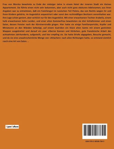 Frau von Murska bewohnte zu Ende der siebziger Jahre in einem Hotel der inneren Stadt ein kleines Appartement. Sie führte einen nicht sehr bekannten, aber auch nicht ganz obskuren Adelsnamen; aus ihren Angaben war zu entnehmen, daß ein Familiengut im russischen Teil Polens, das von Rechts wegen ihr und ihren Kindern gehörte, im Augenblick sequestriert oder sonst den rechtmäßigen Besitzern vorenthalten war. Ihre Lage schien geniert, aber wirklich nur für den Augenblick. Mit einer erwachsenen Tochter Arabella, einem halb erwachsenen Sohn Lucidor, und einer alten Kammerfrau bewohnten sie drei Schlafzimmer und einen Salon, dessen Fenster nach der Kärntnerstraße gingen. Hier hatte sie einige Familienporträts, Kupfer und Miniaturen an den Wänden befestigt, auf einem Guéridon ein Stück alten Samts mit einem gestickten Wappen ausgebreitet und darauf ein paar silberne Kannen und Körbchen, gute französische Arbeit des achtzehnten Jahrhunderts, aufgestellt, und hier empfing sie. Sie hatte Briefe abgegeben, Besuche gemacht, und da sie eine unwahrscheinliche Menge von »Attachen« nach allen Richtungen hatte, so entstand ziemlich rasch eine Art von Salon. ..