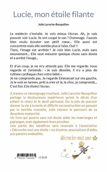 Le médecin s'installe. Je vois mieux l'écran. Ah, je vais pouvoir voir Lucie. Ils ont coupé le son ? Dommage. J'aurais bien voulu écouter son petit coeur... Elle aussi est concentrée mais elle semble plus à l'aise. Ouf !! Tiens, l'image est arrêtée ? Je vois bien Lucie, mais sans mouvement... Elle veut mesurer quelque chose sans doute et a arrêté l'image...Et d'un coup, je ne m'y attends pas. Elle me regarde, nous regarde et j'entends : « Je suis désolée, il n'y a plus de rythme cardiaque chez votre bébé ».Je ne comprends pas. Je regarde Emmanuel sur ma gauche. Je le vois en larmes, prêt à crier et là, le choc, je comprends... C'est fini. Elle éteint l'écran.A travers ce témoignage touchant, Julie Laroche-Bocquillon partage la douloureuse expérience qu'est le décès d'un enfant in utero et le deuil périnatal. De la joie de pouvoir donner la vie à la lente et difficile reconstruction en passant par la terrible nouvelle, Julie retrace le parcours de sa deuxième maternité.Un livre qui pourra sans nul doute aider les mam'anges et pap'anges, mais également leurs proches.Une partie des bénéfices sera reversée à l'association « Décroche-moi une étoile » ou d'autres associations d'aides aux parents endeuillés.