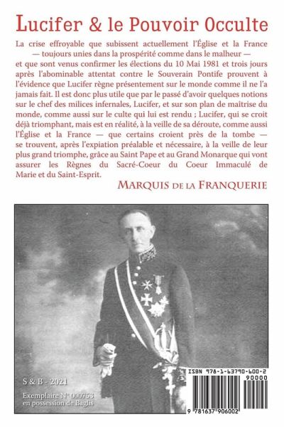 La judéo-maçonnerie, les sectes, le marxisme, la démocratie: synagogue de Lucifer & contre Église. André Le Sage de La Franquerie de La Tourre (1901-1992) (de son nom de plume Marquis de La Franquerie) est un écrivain monarchiste et catholique français, auteur d'ouvrages "politico-mystiques". Il représente un courant providentialiste proche de l'intégrisme, qui joint à la défense d'un ordre politique catholique traditionnel la croyance dans les prophéties et les révélations privées. Il a été camérier secret des papes Pie XII, Jean XXIII et Paul VI à partir de 1939. Il dénonça les infiltrations de la franc-maçonnerie dans l'Église catholique, en accusant en particulier le cardinal Mariano Rampolla del Tindaro. Il lança également des accusations contre le cardinal Pietro Gasparri en décriant sa politique qu'il jugeait proche des cercles maçonniques dans des articles de presse et à la hiérarchie catholique. Il s'intéressa notamment au thème politico-mystique du "grand monarque", très en vogue parmi certains cercles intégristes de son époque.