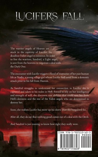 "The way the characters are written and the way the story is told is pure perfection." - Sierra Mclean (Professional Editor) Darkness has never been so tempting... The warrior angels of Heaven are stuck in the captivity of Lucifer; the deadliest Fallen angel in existence. In order to free the warriors, Sandriel, a Light angel, is sent from the heavens to negotiate a deal with the Dark One. The encounter with Lucifer triggers a flood of memories of her past human life as Nadia, a young village girl whom Lucifer had saved from a demonic assault prior to his fall from Heaven. As Sandriel struggles to understand her connection to Lucifer, she is captured and taken to his realm in Hell. Forced to rely on her intelligence and strength of will, she discovers rare abilities that could save her from Hell's denizens and the rest of the Fallen angels who are determined to destroy her. Soon, she realises Lucifer has more up his sleeve than she bargained for. After all, they do say that nothing good comes out of a deal with the Devil. And Sandriel is just coming to know how right they really were. *** REVIEWS: "It is definitely one of the best novels I think I have ever read. It is engaging, has numerous plot twists and cliffhangers." - Sierra Mclean (Professional Editor) "I read so many books across a range of platforms, hard copies, kindle, radish but this book...this book is my absolute favourite!" - GUMBALL001 (Wattpad) "Your story is beautiful on so many levels and your writing is incredible. The emotions that we readers are feeling while reading is extraordinary. I have never in my life read something that has awakened so many emotions within myself." - 1Adeela (Wattpad) "When I tell you, THIS IS HOW YOU WRITE A BAD BOY." - aphroditedd (Wattpad) "Thank you for writing the most beautifully heart-wrenching story with the most mesmerizing character." - Jaya14 (Wattpad)