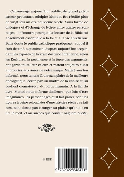 Cet ouvrage aujourd'hui oublié, du grand prédicateur protestant Adolphe Monod, fut réédité plus de vingt fois au dix-neuvième siècle. Sous forme de dialogues et d'échange de lettres entre quatre personnages, il démontre pourquoi la lecture de la Bible est absolument essentielle à la foi et à la vie chrétienne. Sans doute le public catholique pratiquant, auquel il était destiné, a quasiment disparu aujourd'hui ; cependant les exposés de la vraie doctrine chrétienne, selon les Écritures, la pertinence et la force des arguments, ont gardé toute leur valeur, et restent toujours aussi appropriés aux âmes de notre temps. Malgré son ton informel, nous tenons là un exemplaire de la meilleure apologétique, écrite par un maître de la chaire et un profond connaisseur du coeur humain. A la fin du livre, Monod nous informe d'ailleurs, que loin d'être imaginaires, les personnages qu'il fait parler, sont les figures à peine retouchées d'une histoire réelle : ce fait n'est sans doute pas étranger au plaisir qu'on a d'en lire le récit, et au succès que connut naguère Lucile. Cette édition ThéoTeX reproduit celle de 1881.