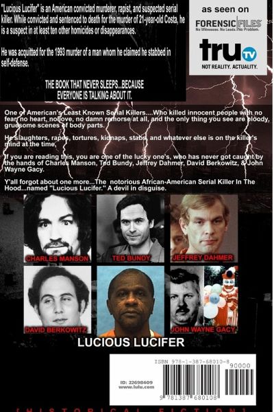 One of the American's Least known Serial killers....who killed innocent people with no fear, no heart, no love, no remorse at all, and the only thing you see are bloody, gruesome scenes of body parts. He slaughters, rapes, tortures, kidnaps, stabs, and whatever else is on the killer's mind at the time. If you are reading this, you are one of the lucky one's who has never got caught by the hands of Charles Manson, Ted Bundy, Jeffrey Dahmer, David Berkowitz & John Wayne Gacy. Y'all forgot about one more...The notorious African-American Serial Killer In The Hood...Name "Lucious Lucifer." A Devil in Disguise.