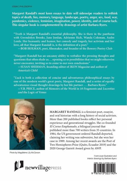 Fearless personal essays from a treasured feminist poet and activist Luck is a collection of essays covering such topics as memory, language, landscape, poetry, anger, sex, food, pandemics, war, violence, feminism, lies, imagination, death, power, identity, and of course luck. Some are full-blown explorations, others brief riffs. Some are prose poetry, others straightforward prose. The author combines scholarly research with personal experience, producing texts both intimate and illuminating. Always attentive to the world around her and the one within, Randall has brought us her most relevant and powerful essays to date.
