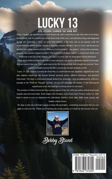 Emily Amadon, my business partner with Snack Lab, and I would always joke that when we no longer owned Snack Lab, we would write a book about some of the crazy and ridiculous things that happened during our ownership. I think we were both kidding at the time, but as our journey with the restaurant/store neared its end, I began to seriously consider the idea. I love to write, and the process has been incredibly cathartic for me. Whenever I start a project-any project-it has to have meaning, purpose, and a positive impact on others. This book had to fit those criteria. As it turns out, Emily even helped me write one of the chapters, so I guess we were right all along about writing that book! I have always believed that if you want to learn and grow, you need to surround yourself with people who are smarter than you. I have spent most of my life doing just that, and through that process, I have gained invaluable lessons that have carried me through all phases of life. Lucky 13: Life Lessons Learned the Hard Way is a motivational and, hopefully, inspirational work that explores significant life lessons through personal stories, biblical references, and practical reflections. The book is structured around thirteen key principles, each accompanied by reflective prompts in the "Food for Thought" sections. As you will read later, the number 13 has held special significance in my life, making it a fitting theme for this book. The narrative is filled with stories from various aspects of my life, offering readers a blend of personal insights and universal truths. Each chapter also includes verses from God's Word to reflect on. This book is meant to serve as inspiration for individuals, families, book clubs, Bible study groups, and Sunday school classes. My hope is that you will find wisdom in these life principles-something meaningful that you can apply to your own life. Thank you for joining me on this journey as I share my life lessons with you.
