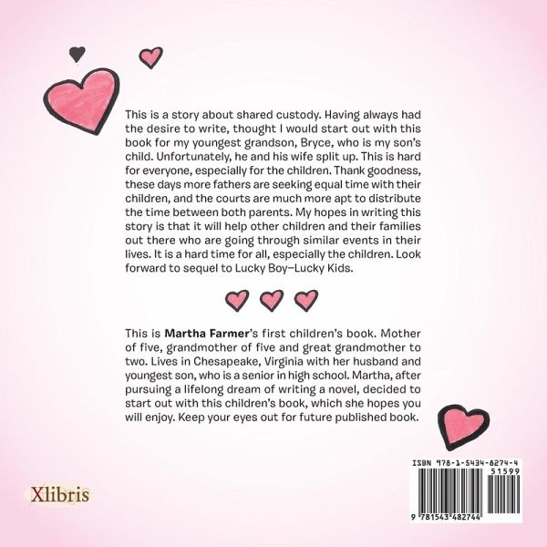 This is a story about shared custody. Having always had the desire to write thought, I would start out with this book for my youngest grandson, Bryce, who is my sons child. Unfortunately, he and his wife split up. This is hard for everyone, especially for the children. Thank goodness, these days more fathers are seeking equal time with their children, and the courts are much more apt to distribute the time between both parents. My hopes in writing this story is that it will help other children and their families out there who are going through similar events in their lives. It is hard time for all, especially the children. Look forward to sequel to Lucky BoyLucky Kids.