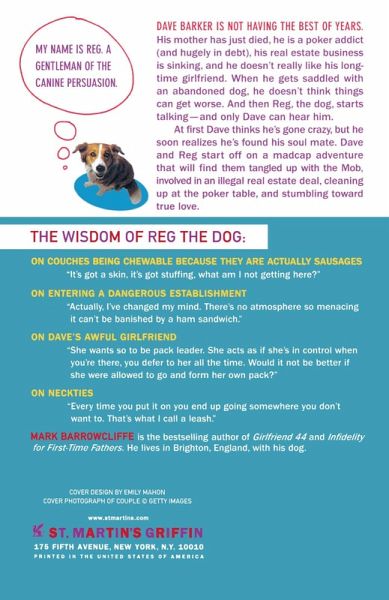 Dave Bartok is not having the best of years. His mother has just died, he is an addicted poker player, and (hugely in debt), his real estate business is sinking, and he doesn't really like his longtime girlfriend. When he gets saddled with an abandoned dog, he doesn't think things can get worse. And then Reg the dog starts talking --and only Dave can hear him. At first Dave thinks he's gone crazy, but he soon realizes he's found his soul mate. Dave and Reg start off on a madcap adventure that will find them tangled up with the mob, involved in an illegal real estate deal, cleaning up at the poker table, and stumbling toward true love. The wisdom of Reg the dog: On couches being chewable because they are actually sausages "It's got a skin, it's got stuffing, what am I not getting here?" On entering a dangerous establishment "Actually, I've changed my mind. There's no atmosphere so menacing it can't be banished by a ham sandwich." On Dave's awful girlfriend "She wants so to be pack leader. She acts as if she's in control when you're there, you defer to her all the time. Would it not be better if she were allowed to go and form her own pack?" On neckties "Every time you put it on you end up going somewhere you don't want to. That's what I call a leash."