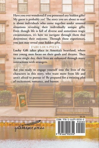 Have you ever wondered if you possessed any hidden gifts? My guess is probably yes! The story you are about to read is about individuals who come together under unusual situations revealing their individually unique gifts. Even though life is full of diverse and sometimes tragic circumstances, it's how we navigate through them that determines their outcome. Through these experiences, you just may reveal your hidden gifts. Lucky Gift takes place in America's heartland, where two young men focus on their goals and dreams. Then in one single day, their lives are enhanced through many interactions with strangers. Are you ready to engage yourself into the lives of the characters in this story, who want more from life and aren't afraid to pursue it? Be prepared for a twisting plot of excitement, romance, and humor.