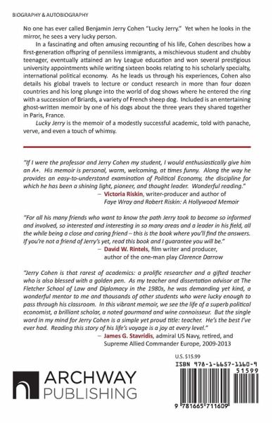 No one has ever called Benjamin Jerry Cohen "Lucky Jerry." Yet when he looks in the mirror, he sees a very lucky person. In a fascinating and often amusing recounting of his life, Cohen describes how a first-generation offspring of penniless immigrants, a mischievous student and chubby teenager, eventually attained an Ivy League education and won several prestigious university appointments while writing sixteen books relating to his scholarly specialty, international political economy. As he leads us through his experiences, Cohen also details his global travels to lecture or conduct research in more than four dozen countries and his long plunge into the world of dog shows where he entered the ring with a succession of Briards, a variety of French sheep dog. Included is an entertaining ghost-written memoir by one of his dogs about the three years they shared together in Paris, France. Lucky Jerry is the memoir of a modestly successful academic, told with panache, verve, and even a touch of whimsy. "If I were the professor and Jerry Cohen my student, I would enthusiastically give him an A+. His memoir is personal, warm, welcoming, at times funny. Along the way he provides an easy-to-understand examination of Political Economy, the discipline for which he has been a shining light, pioneer, and thought leader. Wonderful reading." - Victoria Riskin, writer-producer and author of Faye Wray and Robert Riskin: A Hollywood Memoir "For all his many friends who want to know the path Jerry took to become so informed and involved, so interested and interesting in so many areas and a leader in his field, all the while being a close and caring friend - this is the book where you'll find the answers. If you're not a friend of Jerry's yet, read this book and I guarantee you will be." - David W. Rintels, film writer and producer, author of the one-man play Clarence Darrow "Jerry Cohen is that rarest of academics: a prolific researcher and a gifted teacher who is also blessed with a golden pen. As my teacher and dissertation advisor at The Fletcher School of Law and Diplomacy in the 1980s, he was demanding yet kind, a wonderful mentor to me and thousands of other students who were lucky enough to pass through his classroom. In this vibrant memoir, we see the life of a superb political economist, a brilliant scholar, a noted gourmand and wine connoisseur. But the single word in my mind for Jerry Cohen is a simple yet proud title: teacher. He's the best I've ever had. Reading this story of his life's voyage is a joy at every level." - James G. Stavridis, admiral US Navy, retired, and Supreme Allied Commander Europe, 2009-2013