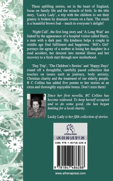 These uplifting stories, set in the heart of England, focus on family life and the miracle of birth. In the title story, 'Lucky Lady', a trip with the children to see their granny is broken by dramatic events on a farm. The result is a beautiful brown foal - much to everyone's delight! 'Night Call', the first long story and 'A Long Wait' are linked by the appearance of a hospital visitor called Harry, a man with a dark past. His kindness helps a couple in middle age find fulfilment and happiness. 'Bill's Girl' portrays the agony of a mother at losing her daughter in a road accident, her descent into mental illness and her recovery to a fresh start through new motherhood. 'Day Trip', 'The Children's Stories' and 'Happy Days' round off a thoughtful, carefully paced collection that touches on issues such as jealousy, body anxiety, Christian charity and the treatment of our elderly people. B C Collins has added five poems to her stories as an extra and thoroughly enjoyable bonus. Don't miss them! Since her first novella, BC Collins has become widowed. To keep herself occupied and to do some good, she has begun knitting for a local charity. Lucky Lady is her fifth collection of stories.