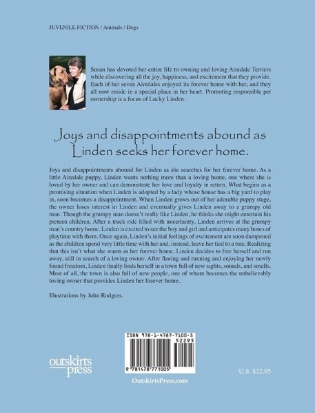 Joys and disappointments abound for Linden as she searches for her forever home. As a little Airedale puppy, Linden wants nothing more than a loving home, one where she is loved by her owner and can demonstrate her love and loyalty in return. What begins as a promising situation when Linden is adopted by a lady whose house has a big yard to play in, soon becomes a disappointment. When Linden grows out of her adorable puppy stage, the owner loses interest in Linden and eventually gives Linden away to a grumpy old man. Though the grumpy man doesn't really like Linden, he thinks she might entertain his preteen children. After a truck ride filled with uncertainty, Linden arrives at the grumpy man's country home. Linden is excited to see the boy and girl and anticipates many hours of playtime with them. Once again, Linden's initial feelings of excitement are soon dampened as the children spend very little time with her and, instead, leave her tied to a tree. Realizing that this isn't what she wants as her forever home, Linden decides to free herself and run away, still in search of a loving owner. After fleeing and running and enjoying her newly found freedom, Linden finally finds herself in a town full of new sights, sounds, and smells. Most of all, the town is also full of new people, one of whom becomes the unbelievably loving owner that provides Linden her forever home. Illustrations by John Rodgers.
