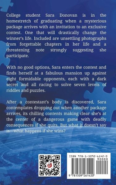 College student Sara Donovan is in the homestretch of graduating when a mysterious package arrives with an invitation to an exclusive contest. One that will drastically change the winner's life. Included are unsettling photographs from forgettable chapters in her life and a threatening note strongly suggesting she participate. With no good options, Sara enters the contest and finds herself at a fabulous mansion up against eight formidable opponents, each with a dark secret and all racing to solve seven levels of riddles and puzzles. After a contestant's body is discovered, Sara contemplates dropping out when another package arrives, its chilling contents making clear she's at the center of a dangerous game with deadly consequences if she quits. But what it doesn't say is-what happens if she wins?