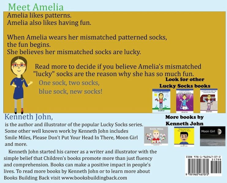 A little girl, who likes patterns, believes her mismatched "lucky" socks are the reason why fun activities occur at the end of each week. Fun things always seem to happen when Amelia wears her lucky socks and Amelia loves having fun. Mom and Dad always make Amelia wear her matching socks first but as the week goes on and the matching socks become less, Amelia gets to wear her mismatched "lucky" socks. Read more to decide if you believe Amelia's mismatched "lucky" socks are the reason why she has so much fun.