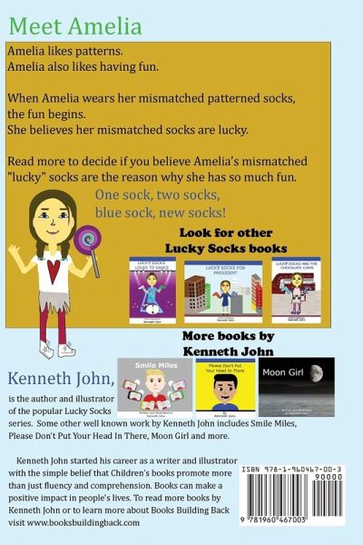A little girl, who likes patterns, believes her mismatched "lucky" socks are the reason why fun activities occur at the end of each week. Fun things always seem to happen when Amelia wears her lucky socks and Amelia loves having fun. Mom and Dad always make Amelia wear her matching socks first but as the week goes on and the matching socks become less, Amelia gets to wear her mismatched "lucky" socks. Read more to decide if you believe Amelia's mismatched "lucky" socks are the reason why she has so much fun.