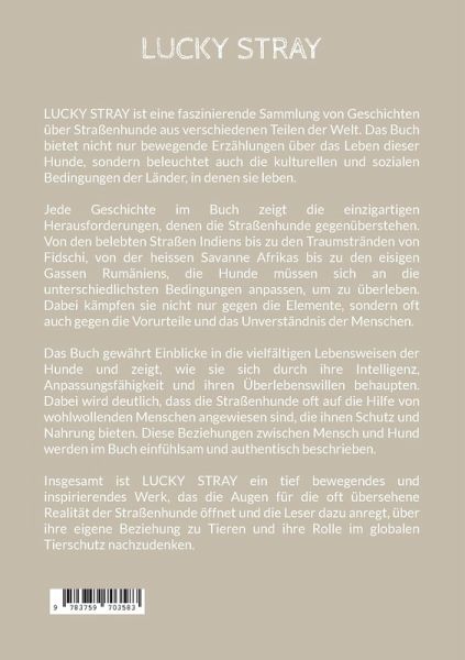 LUCKY STRAY ist eine faszinierende Sammlung von Geschichten über Strassenhunde aus verschiedenen Teilen der Welt. Das Buch bietet nicht nur bewegende Erzählungen über das Leben dieser Hunde, sondern beleuchtet auch die kulturellen und sozialen Bedingungen der Länder, in denen sie leben. Jede Geschichte im Buch zeigt die einzigartigen Herausforderungen, denen die Strassenhunde gegenüberstehen. Von den belebten Strassen Indiens bis zu den Traumstränden von Fidschi, von der heissen Savanne Afrikas bis zu den eisigen Gassen Rumäniens, die Hunde müssen sich an die unterschiedlichsten Bedingungen anpassen, um zu überleben. Dabei kämpfen sie nicht nur gegen die Elemente, sondern oft auch gegen die Vorurteile und das Unverständnis der Menschen. Das Buch gewährt Einblicke in die vielfältigen Lebensweisen der Hunde und zeigt, wie sie sich durch ihre Intelligenz, Anpassungsfähigkeit und ihren Überlebenswillen behaupten. Dabei wird deutlich, dass die Strassenhunde oft auf die Hilfe von wohlwollenden Menschen angewiesen sind, die ihnen Schutz und Nahrung bieten. Diese Beziehungen zwischen Mensch und Hund werden im Buch einfühlsam und authentisch beschrieben. Insgesamt ist LUCKY STRAY ein tief bewegendes und inspirierendes Werk, das die Augen für die oft übersehene Realität der Strassenhunde öffnet und die Leser dazu anregt, über ihre eigene Beziehung zu Tieren und ihre Rolle im globalen Tierschutz nachzudenken.