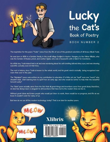 The inspiration for the poem "Tesla '' came from the life of one of the greatest scientists of all times, Nikola Tesla. He was born in 1856 in a Serbian family, in the small village Smiljani in Austro- Hungary, to the father Milutin, who was the Serbian Orthodox priest, and mother Djuka, who was a housewife with a talent for inventions. As a little boy, Tesla indeed had a cat and was wondering about his cat's bristling tail and shiny eyes, and was showing scientific curiosity even at that time. The rest is history since Tesla is known to the whole world, and his great mind is actually being recognized now more than ever in the past. The "Alphabet" poem was written as my contribution to education. If a little cat can "spell" even one "word," why shouldn't kids start learning how to spell from an early age, and who would be better to help than the beautiful tomcat Lucky? The "Idea" poem actually came from the fact that all great things and inventions come from great ideas; therefore, an idea has always been a vanguard to all inventions that have led to the modern time we live in. Without great ideas and brave people who would put them to work, there would be no progress, and life as we know it wouldn't exist for many of us. But how do we use all the modern technology today? That is an idea for another poem.
