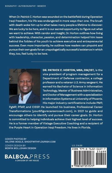 When Dr. Patrick C. Horton was wounded on the battlefield during Operation Iraqi Freedom, his life was endangered in more ways than one. The brush with death woke him up to what takes many people a lifetime to discover: We are lucky to be here, and it is our sacred opportunity to figure out what we want to achieve. With candor and insight, Dr. Horton outlines how living with leadership, character, passion, and determination helped him leave behind the foibles of his youth to achieve executive and entrepreneurial success. Even more importantly, he outlines how readers can pinpoint and pursue their own goals for an unapologetically successful existence in which they, too, feel lucky to be here.