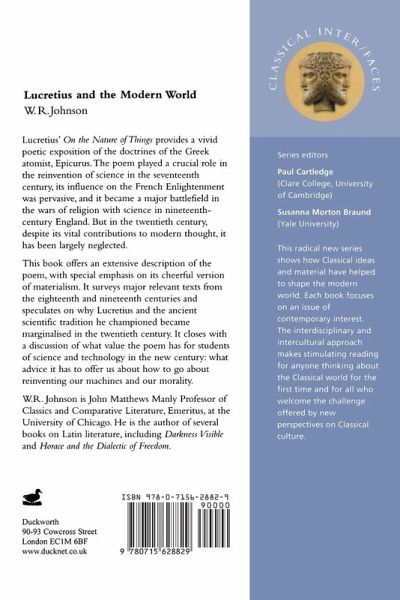 Lucretius' On the Nature of Things - one of the glories of Latin literature - provides a vivid poetic exposition of the doctrines of the Greek atomist, Epicurus. The poem played a crucial role in the reinvention of science in the seventeenth century, its influence on the French Enlightenment was powerful and pervasive, and it became a major battlefield in the wars of religion with science in nineteenth-century England. But in the twentieth century, despite its vital contributions to modern thought and civilisation, it has been largely neglected by common readers and scientists alike. This book offers an extensive description of the poem, with special emphasis on its cheerful version of materialism and on its attempt to devise an ethical system that suits such a universe. It surveys major relevant texts form the eighteenth and nineteenth centuries (Dryden, Diderot, Voltaire, Tennyson, Santayana) and speculates on why Lucretius and the ancient scientific tradition he championed has become marginalised in the twentieth century. It closes with a discussion of what value the poem has for students of science and technology in the new century: what advice it has to offer us about how to go about reinventing our machines and our morality.