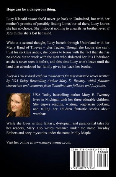 Hope can be a dangerous thing. Lucy Kincaid swore she'd never go back to Undraland, but with her mother's promise of possibly finding Linus buried there, Lucy knows she has no choice. She'll stop at nothing to unearth her brother, even if Jens thinks she's lost her mind. Without a second thought, Lucy barrels through Undraland with her Merry Band of Thieves - plus Tucker. Though she knows she can't trust his reckless antics, she comes to terms with the fact that she has no choice but to work with the man who abducted her. It's Undraland as she's never seen it before, and this time Lucy won't leave until the land that abandoned her family gives her back her brother. Lucy at Last is book eight in a nine-part fantasy romance series written by USA Today Bestselling Author Mary E. Twomey.