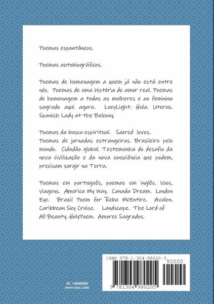 Bilingual poems, many of them. A Brazilian poet, citizen of the world. Autobiographical poems of a romantic sacred love. A life lived and gone. Honoring her, Lucy. Honoring women and the sacred feminine in all. Poems of the spiritual quest. A Brazilian abroad, searching worlds, walking the path of discovery. Global citizen. Journeys. High away flights. Dubai. America coast to coast. Canada. Cartagena. London. Secret loves. São Paulo. Brazil. Poemas autobiográficos de um amor romântico. Uma vida que existiu e já se foi. Homenagem a ela, Lucy. Homenagem ao feminino sagrado, a todas as mulheres. Poemas da busca espiritual. De jornadas. Brasileiro no exterior, experimentando mundos, descobrindo caminhos. Visão global, cidadão do planeta. Poemas de viagens, de altos voos. Havaí. Dubai. Estados Unidos de costa a costa. Canadá. Cartagena. Londres. Amores sagrados. São Paulo. Brasil. Amores sagrados.