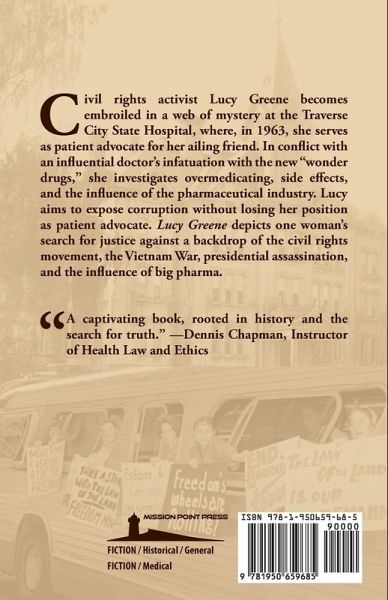 Civil rights activist Lucy Greene becomes embroiled in a web of mystery at the Traverse City State Hospital, where, in 1963, she serves as patient advocate for her ailing friend. In conflict with an influential doctor's infatuation with the new "wonder drugs," she investigates overmedicating, side effects, and the influence of the pharmaceutical industry. Lucy aims to expose corruption without losing her position as patient advocate. Lucy Greene depicts one woman's search for justice against a backdrop of the civil rights movement, the Vietnam War, presidential assassination, and the influence of big pharma.